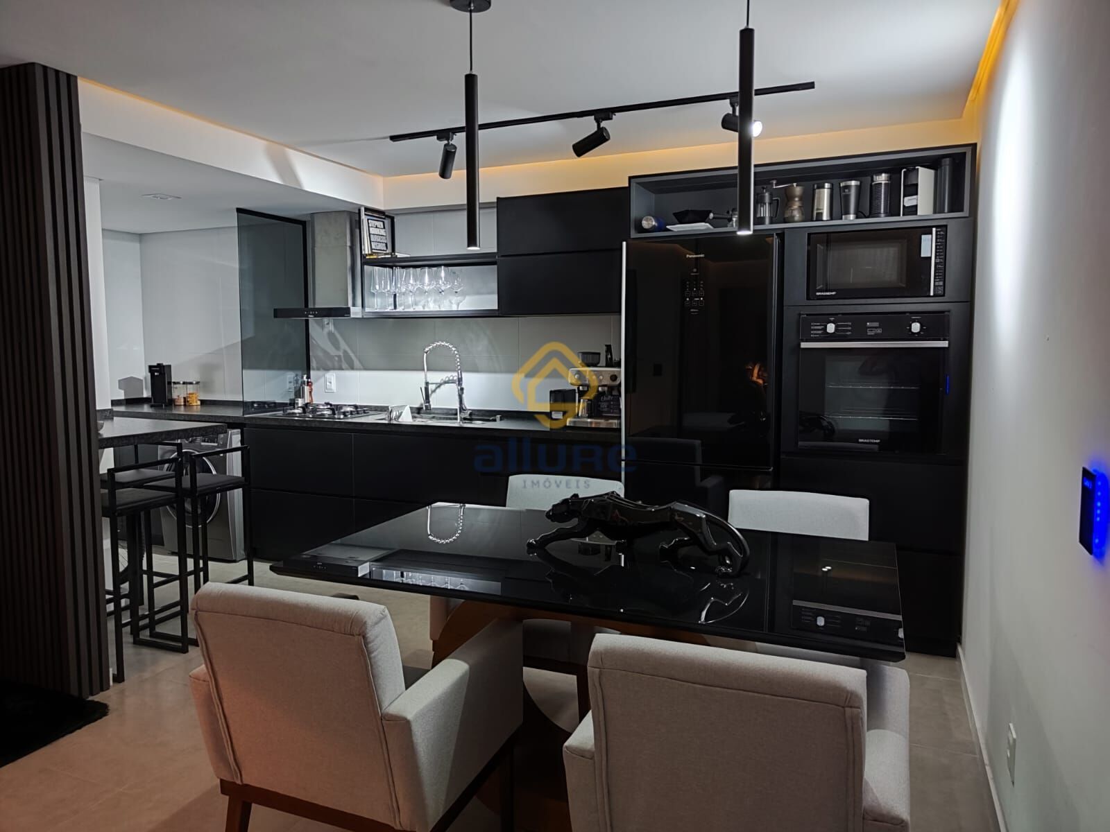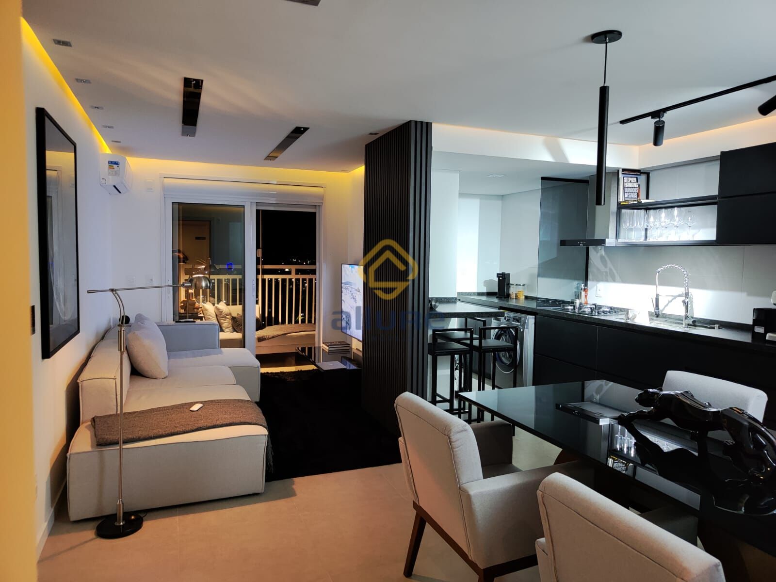 São 2 dormitórios (sendo uma suíte), cozinha, lavanderia, sala de jantar e estar integradas, sacada com churrasqueira e fechamento em vidro, onde foi criado um aconchegante espaço de escritório com uma vista incrível para o pôr do sol.