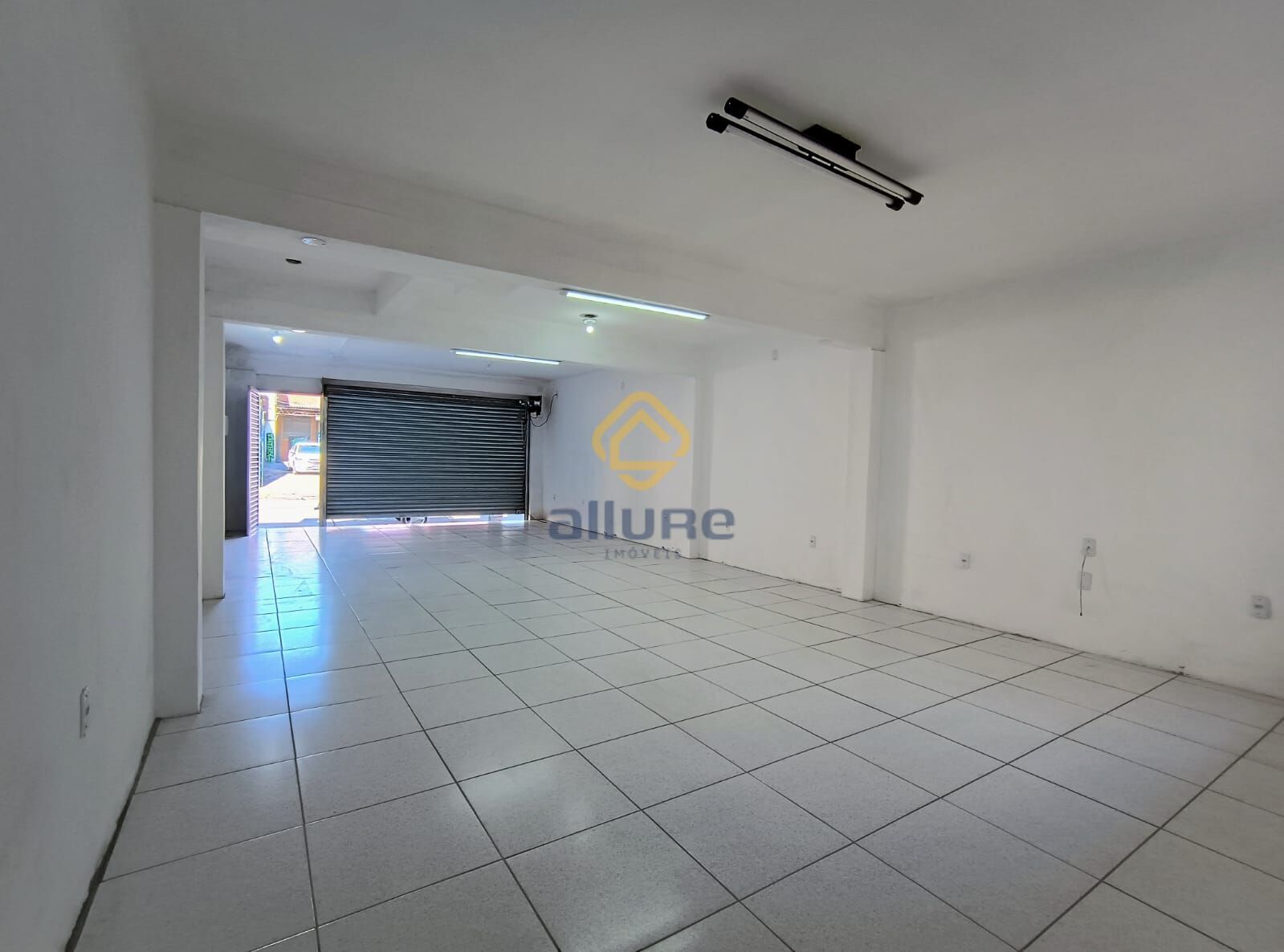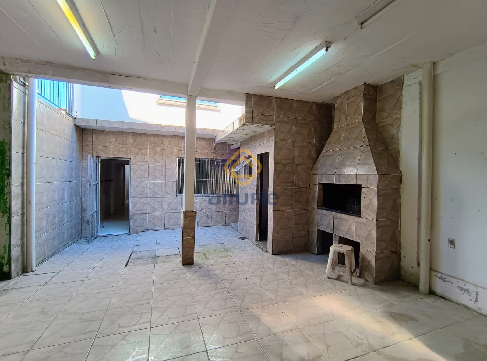 O imóvel conta com loja térrea principal na parte frontal, seguida por área de luz, cozinha, banheiros e pátio central com área coberta e churrasqueira.
